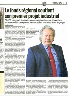 Le fonds de développement régional de la Communauté régionale de la Broye (COREB), créé en 2006, soutient son premier projet industriel. L'heureuse élue est l'invention de Gianfranco Passoni, le KL Quick-Lines («LL» du le avril 2009), qui permet de lancer automatiquement un fil électrique dans les canalisations. Facilitant ainsi la vie des électriciens et la rentabilité de leur travail.
